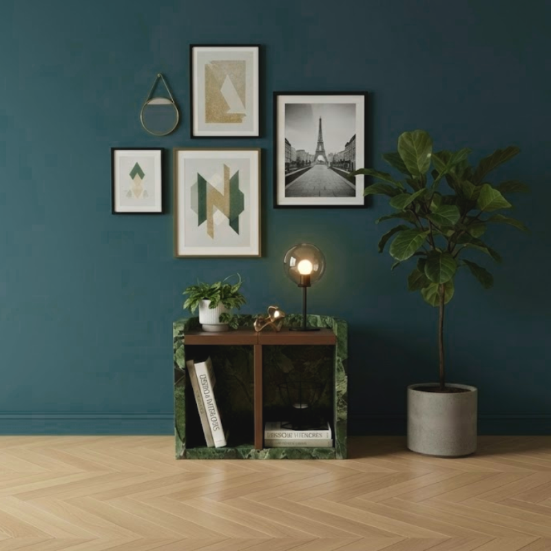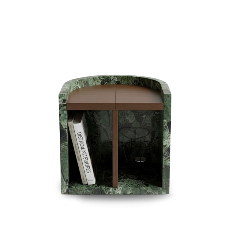 Esta peça assinada é uma fusão de materiais e funções. A estrutura externa em arco de rocha contrasta com o interior e o tampo em madeira, que possui divisórias. É uma peça decorativa versátil, perfeita para ser usada como mesa lateral, pequeno bar, banco ou um sofisticado revisteiro.